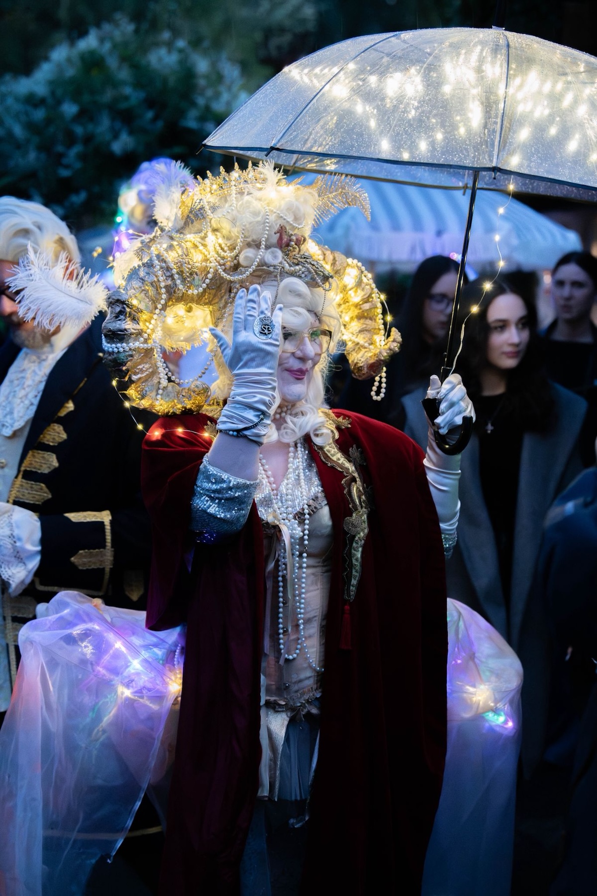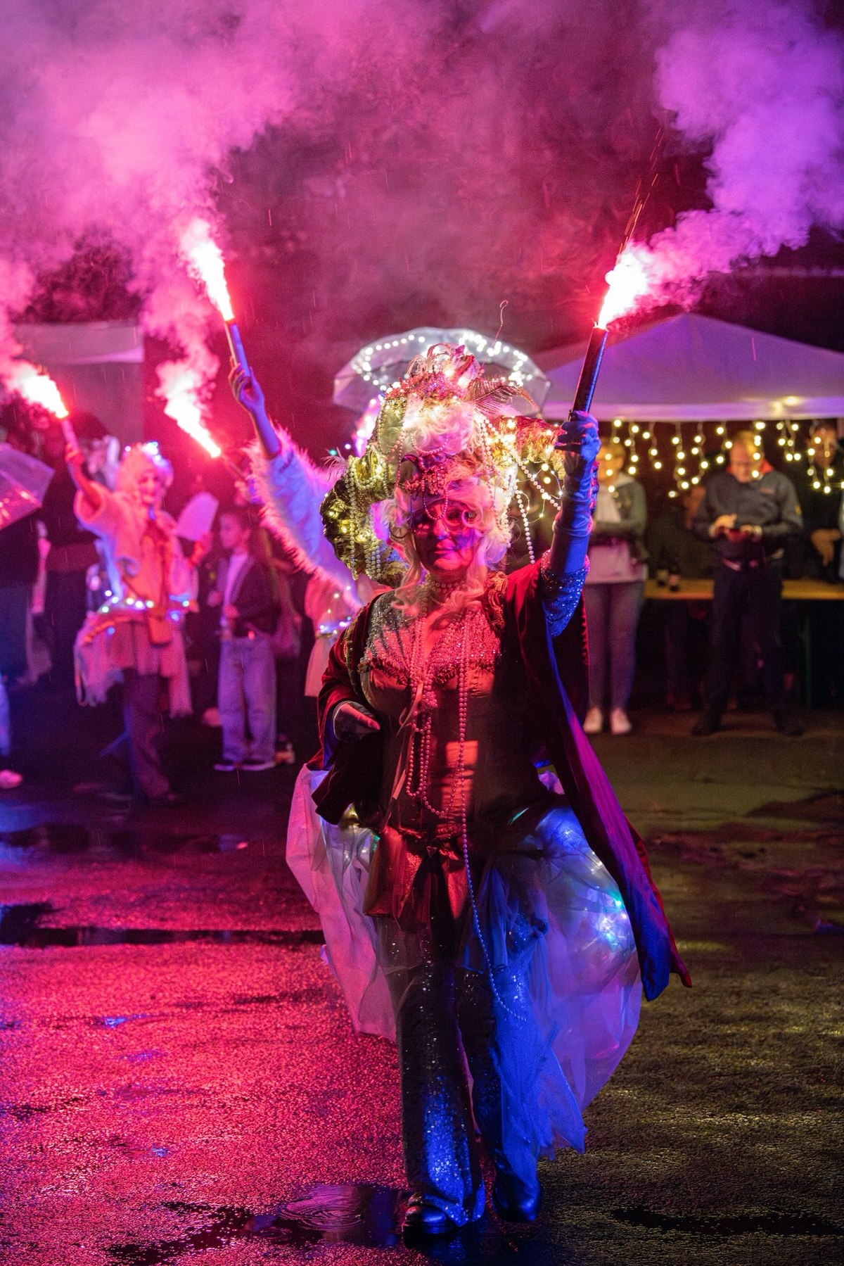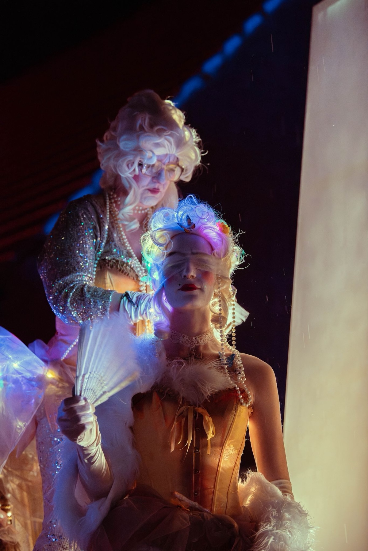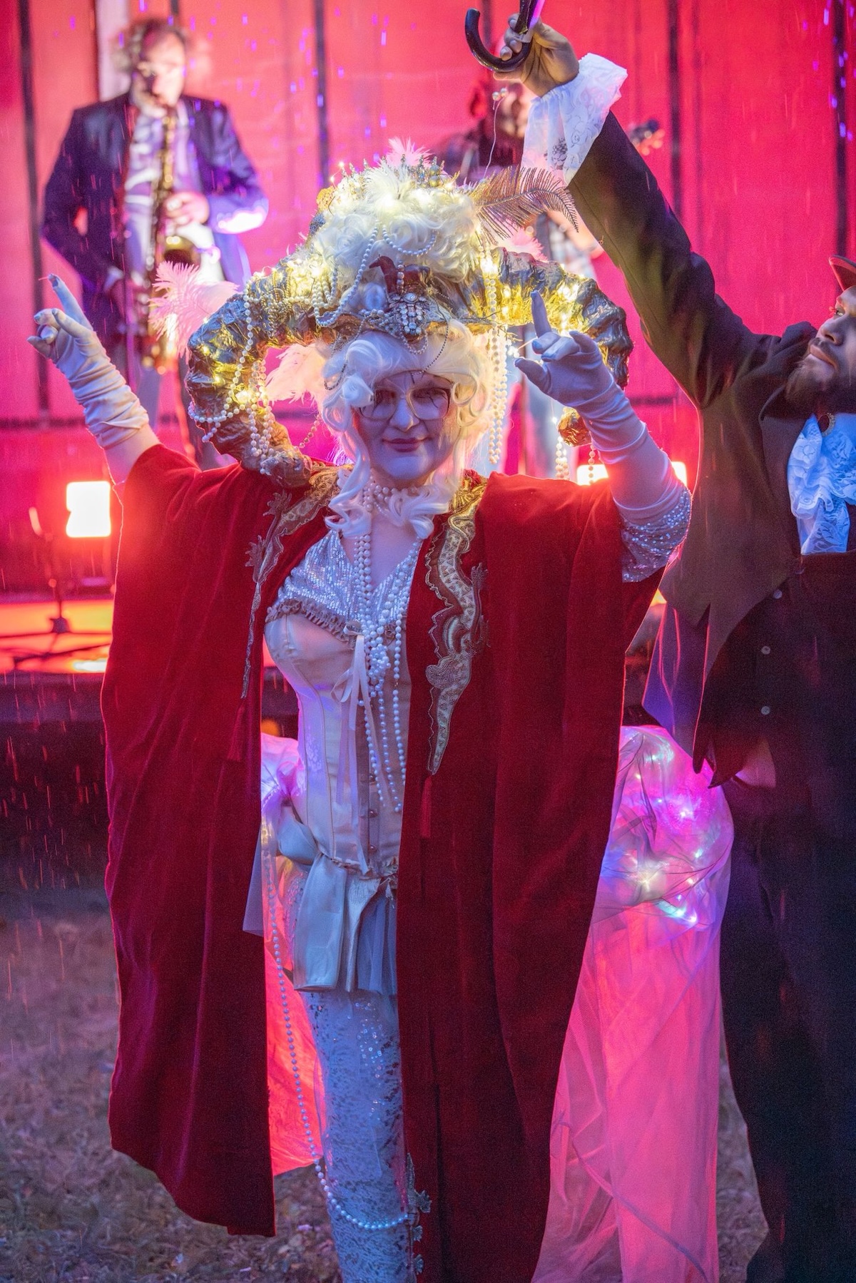 In einem ihrer spektakulärsten Kostüme schlüpft Simone Beckmann in die Rolle einer Rokoko-Dame, die wirkt, als sei sie direkt aus einem überdrehten historischen Gemälde entstiegen. Das üppige Perlenornament, die kunstvolle Turmfrisur und das warm glühende Farbspiel ihres Gewands zeigen, wie tief Simone in ihre Performances eintaucht. Nichts an diesem Auftritt ist »Verkleidung« – es ist lebendige Kunst, ein Gesamtkunstwerk, das genauso funkelt wie ihre neon-expressiven Gemälde.