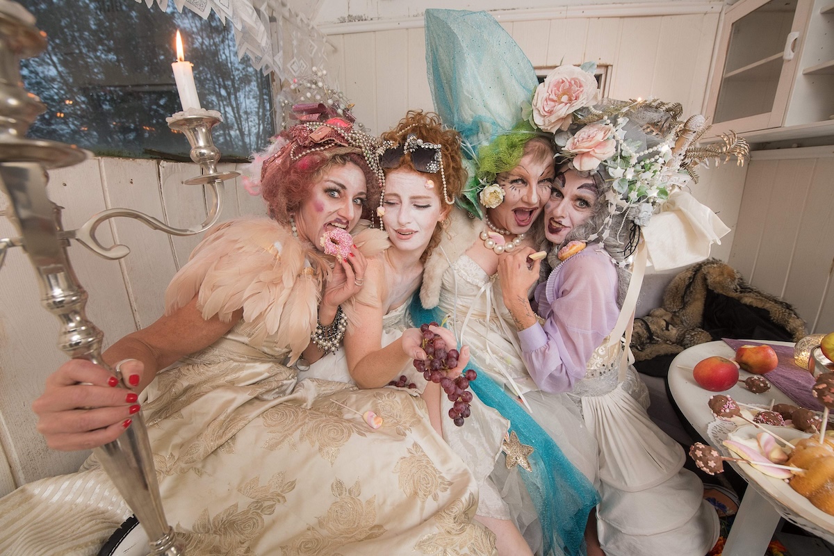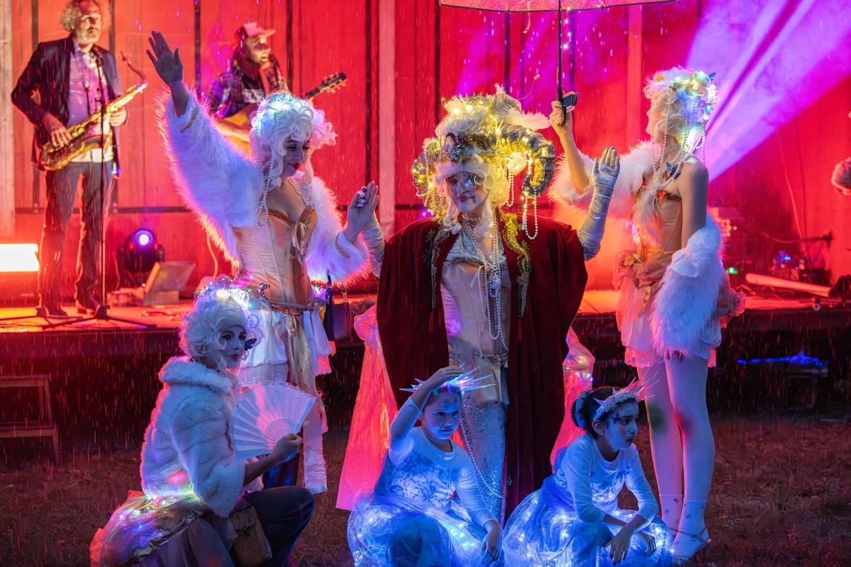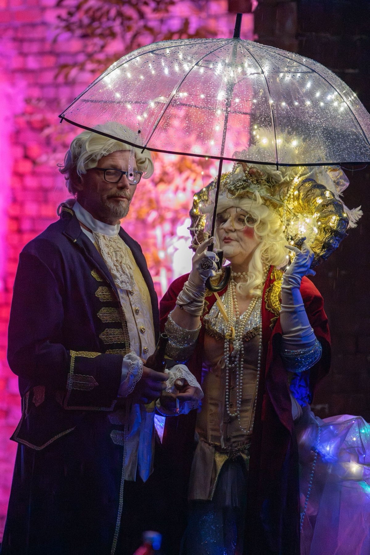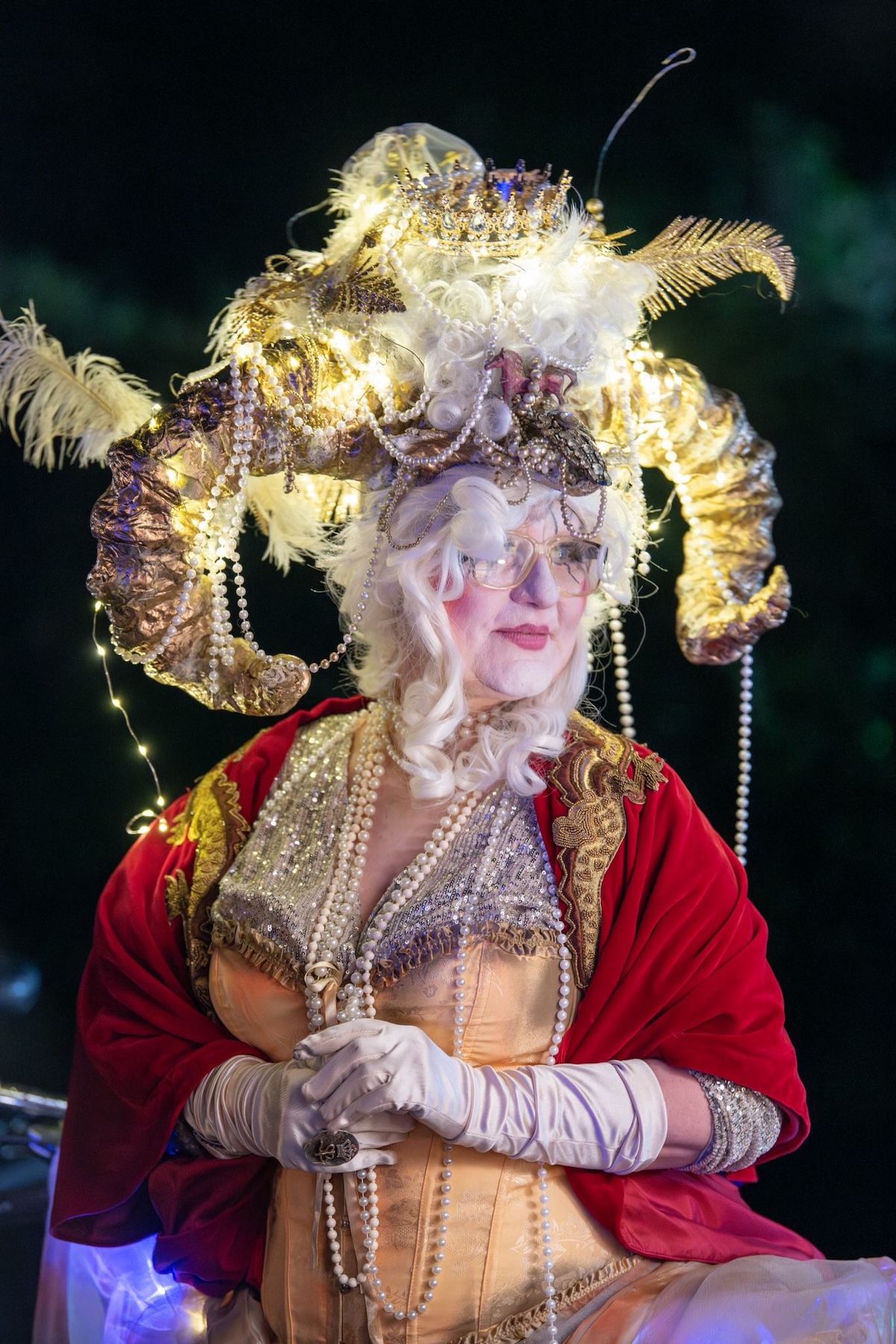 In einem ihrer spektakulärsten Kostüme schlüpft Simone Beckmann in die Rolle einer Rokoko-Dame, die wirkt, als sei sie direkt aus einem überdrehten historischen Gemälde entstiegen. Das üppige Perlenornament, die kunstvolle Turmfrisur und das warm glühende Farbspiel ihres Gewands zeigen, wie tief Simone in ihre Performances eintaucht. Nichts an diesem Auftritt ist »Verkleidung« – es ist lebendige Kunst, ein Gesamtkunstwerk, das genauso funkelt wie ihre neon-expressiven Gemälde.