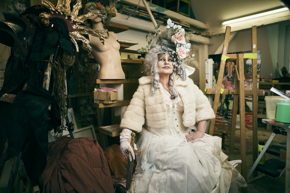 Simone Beckmann ist jedoch weit mehr als Malerin. Kostüme, Performances, Inszenierungen – all das gehört zu ihrem künstlerischen Kosmos. Besonders eindrucksvoll wird das in einer Szene sichtbar, die Jörg Windau fotografiert hat: