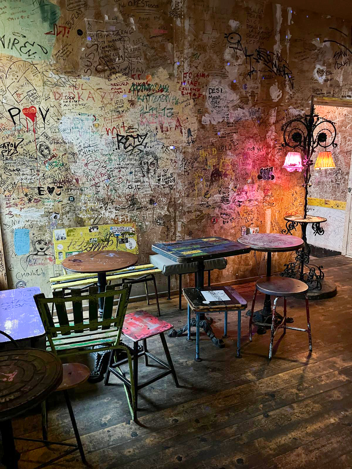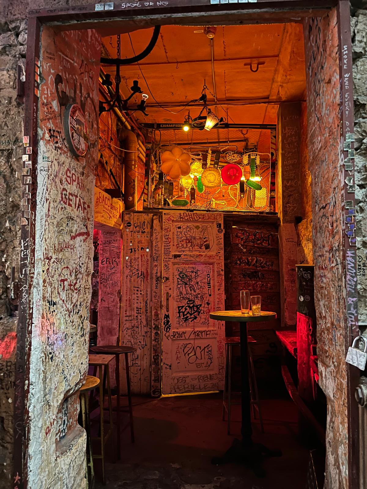 Stell dir vor: ein riesiger Innenhof, der abends zur Tanzfläche wird, Wände voller Graffiti, Sticker, Lampen, Möbel und Objekte, die aussehen, als hätte man sie aus allen möglichen Ecken der Welt zusammengesammelt. Jeder Raum hat sein eigenes Thema – von der entspannten Weinbar über Shisha-Lounges bis hin zu verrückten Kunstinstallationen. Drei Etagen pure Inspiration, an jeder Ecke etwas Neues zu entdecken.