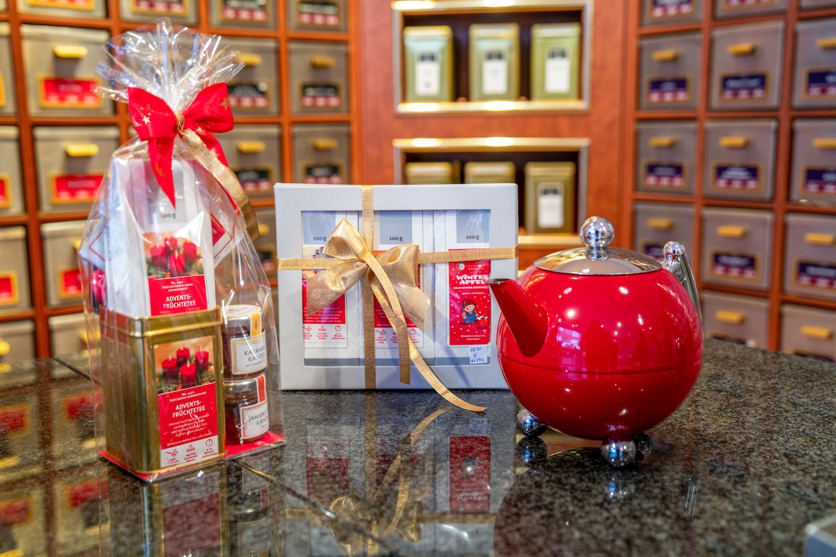 Rund 400 Teesorten aus aller Welt – darunter viele weihnachtliche Klassiker – machen den Besuch bei TeeGschwendner zum Genuss. Neben internationalen Tees gibt es liebevolle Geschenkideen, fertige Sets oder individuell zusammengestellte Präsente. Schönes Zubehör wie Tassen, Kannen, besondere Kandissorten sowie Honig und sü.e Leckereien runden das Sortiment ab. Hier findet jeder seinen Lieblingsgeschmack.