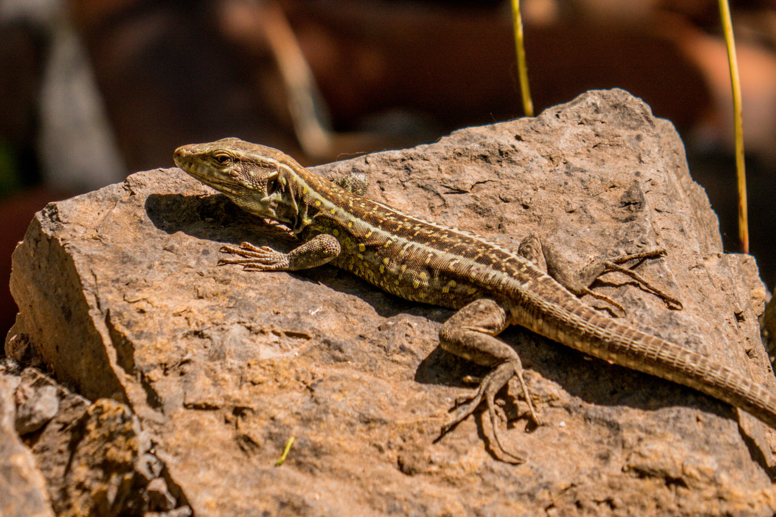 Auf den sonnengewärmten Steinen halten sich viele westkanarische Eidechsen auf. Diese tagaktiven, sonnenhungrigen Tiere ernähren sich von Insekten und Spinnen und sind flink und scheu.